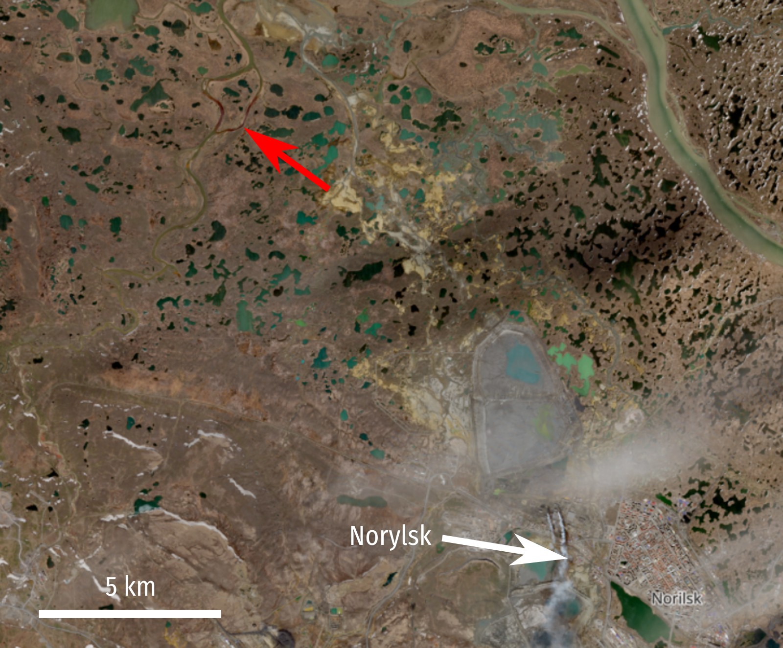 Negatywne skutki rabunkowej eksploatacji złóż metali. Zdjęcie pokazuje skutek wycieku ropy do wód powierzchniowych (czerwona plama wskazana czerwoną strzałką to węglowodory) w okolicach Norylska w Rosji. Znajdują się tam jedne z największych na świecie złóż rud niklu. Zdjęcie: Europejska Agencja Kosmiczna, 31 maja 2020.