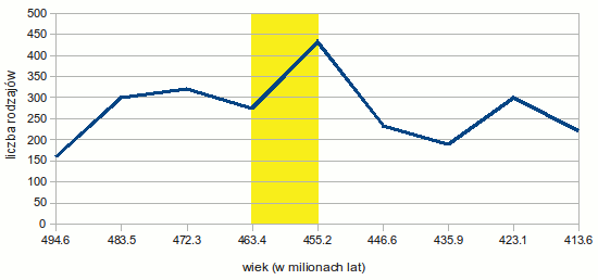 Około 460 mln lat temu (ordowik) znacząco wzrosła liczba rodzajów i rodzin zwierząt morskich. Na wykresie liczba rodzin trylobitów (na podstawie