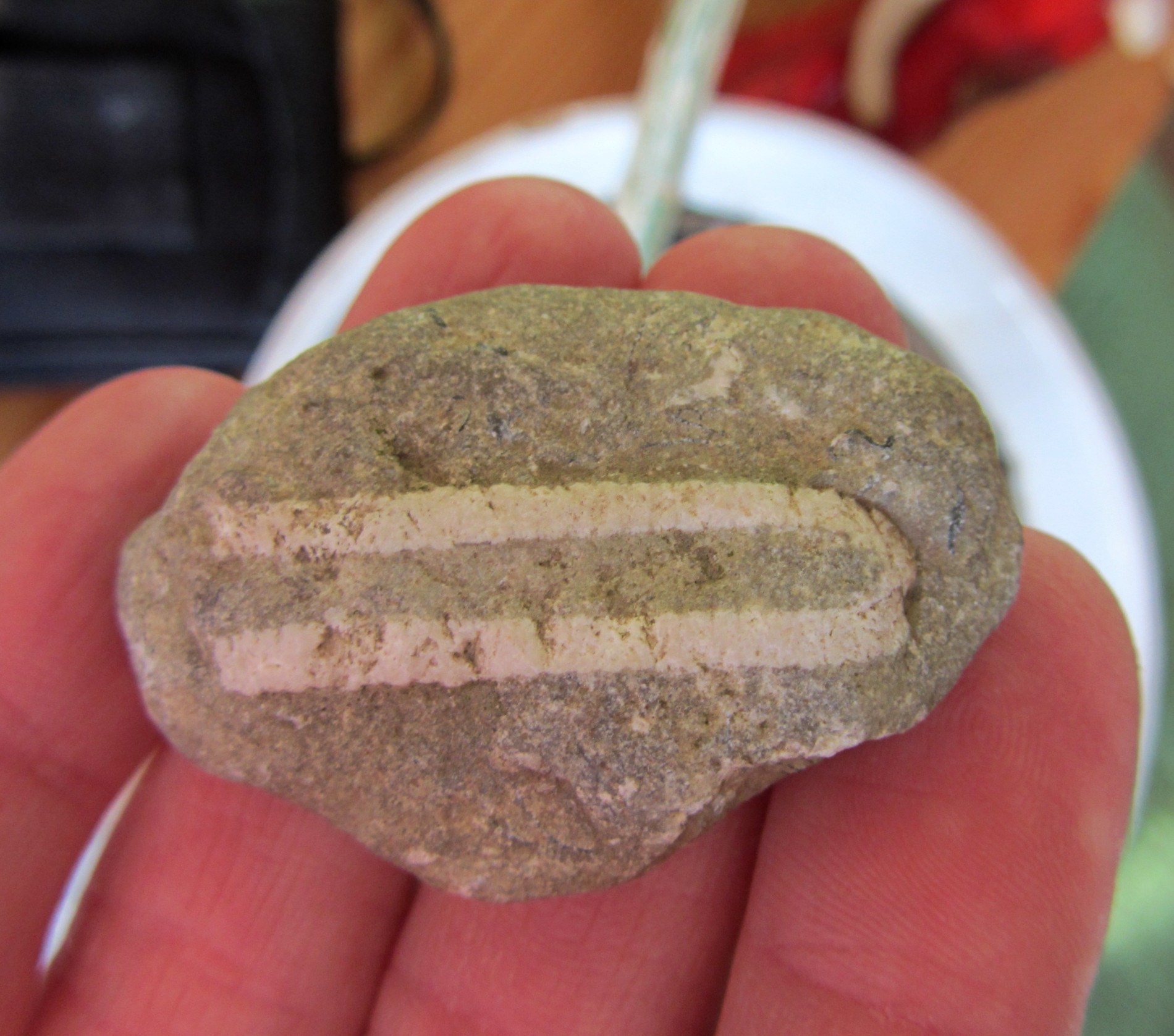 Okrągłe, lekko pomarańczowe szczątki, z widocznym kanałem osiowym, to pojedyncze człony łodyg liliowców. W taki sposób pozostałości tych zwierząt są często zachowane w ordowickich i sylurskich wapieniach przyniesionych do Polski przez lądolód skandynawski.